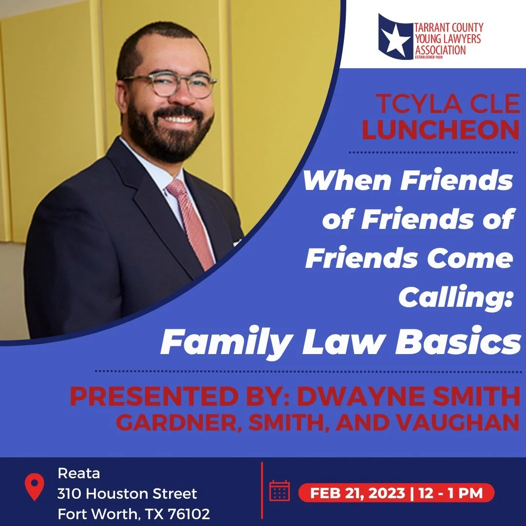 Dwayne Smith is the managing partner of Gardner Smith & Vaughan, a family-law firm in Fort Worth. He and his firm help their clients maintain and protect their children, assets, and relationships during and after the divorce process. Dwayne has a broad range of experience, having represented people with negative net worth, assets valued in the ten figures, and everything in between. This presentation will give you the information you need to assess and, if you want to, represent that distant family member or friend of a friend of a friend who calls you with a family-law question. If it hasn’t happened yet, it will. Please register here.